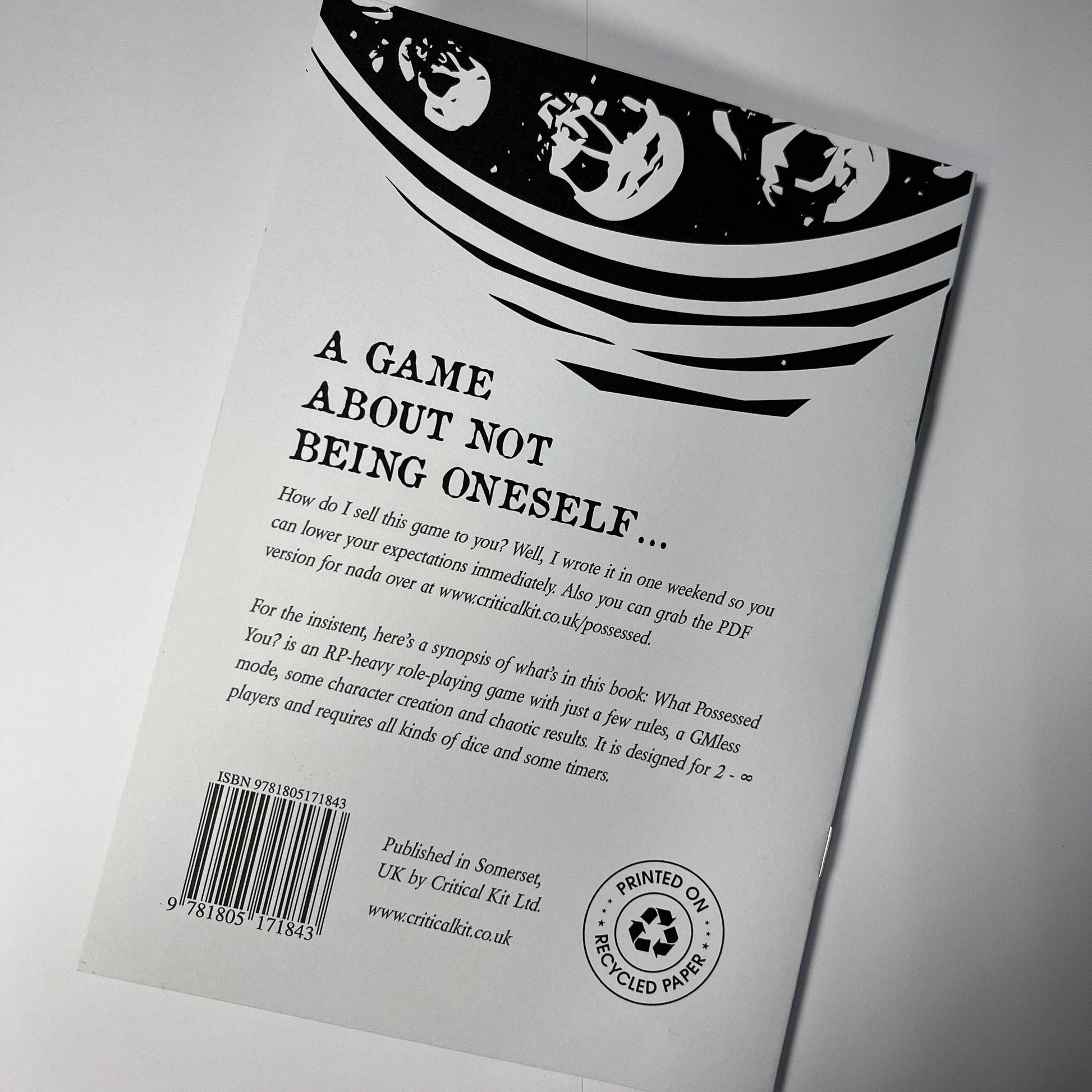 What Possessed You? is an RP-heavy role-playing game with just a few rules, a GMless mode, some character creation and chaotic results. It is designed for 2 to ∞ players and requires all kinds of dice and some timers.